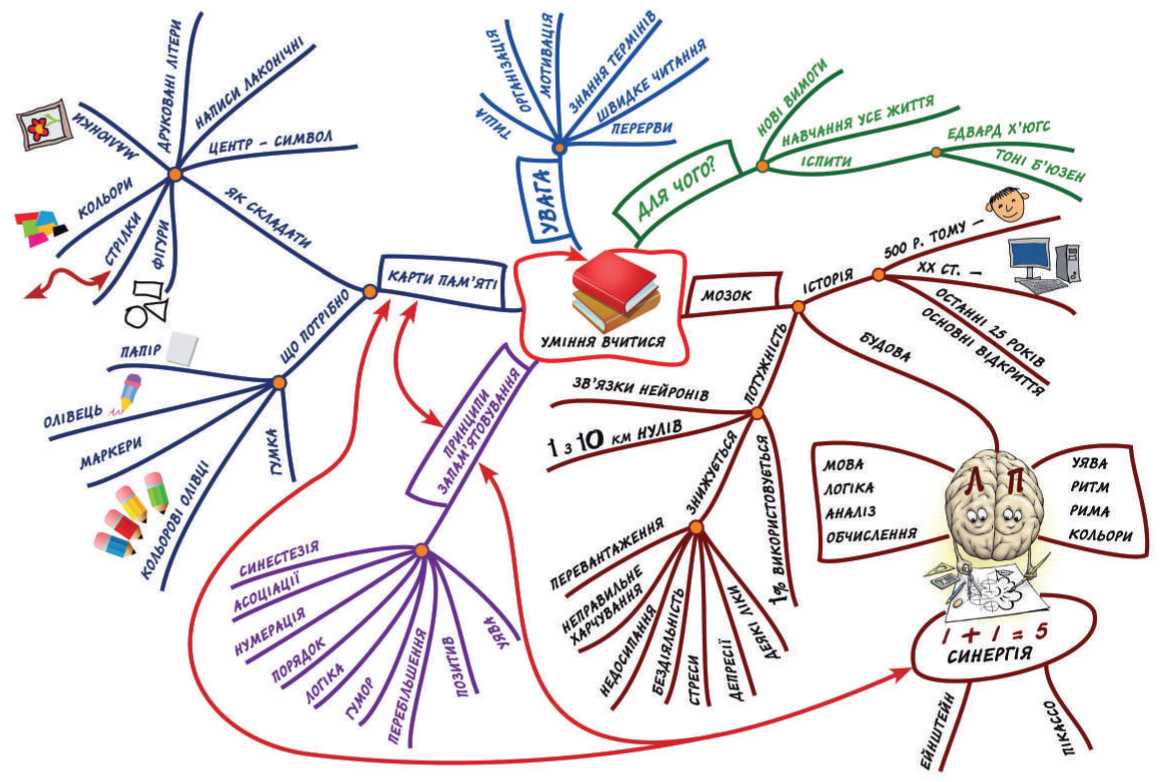 Психолог Тоні Б'юзен запропонував пропонує замість класичних конспектів розробляти карти пам'яті (малюнок на наступній сторінці). Вони залучають до збалансованої роботи обидві півкулі мозку. Карти пам'яті допомагають створити цілісний образ навчального матеріалу — ключових понять і взаємозв'язків між ними.
