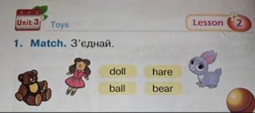 - Зараз ми з вами вивчимо назви деяких іграшок (a ball, a doll, a bear, a hare).