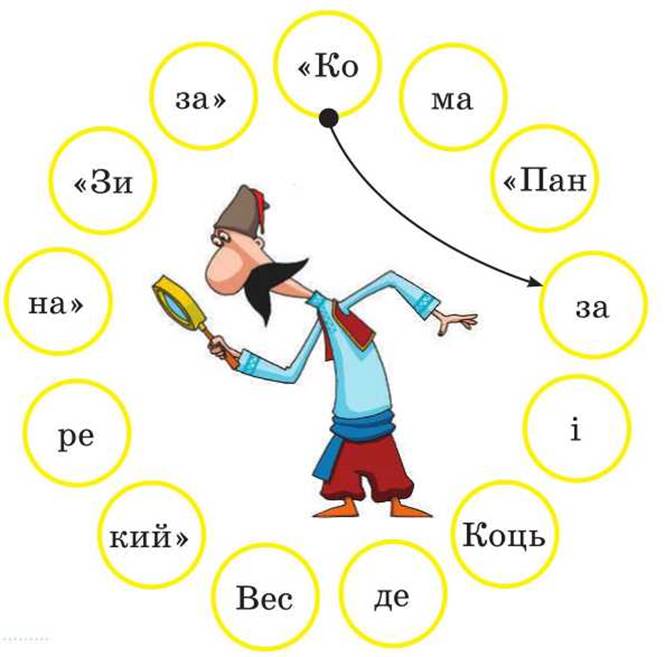2. Розгадай головоломку, у якій зашифровано назви опер для дітей, написані Миколою Лисенком. Читати слід за годинниковою стрілкою, пропускаючи щоразу однакову кількість кружечків зі складами. Запиши ці назви.